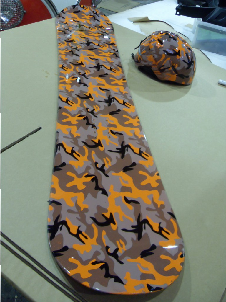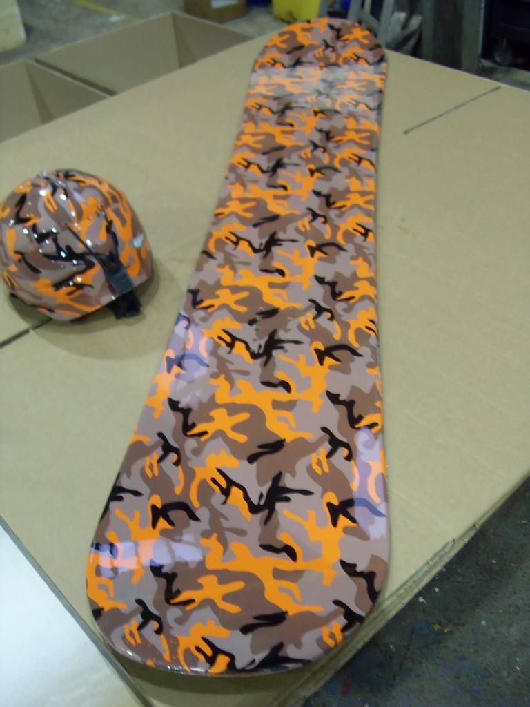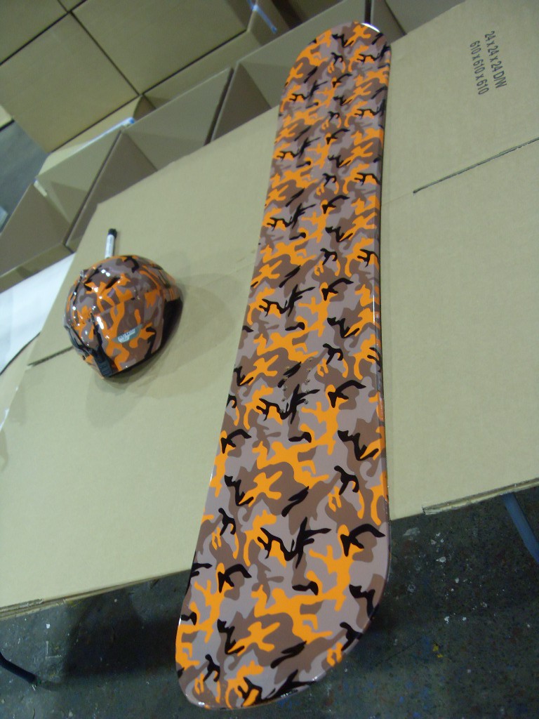 Snowboard And Protective Helmet Coated On Camouflage Hydrographic Film
